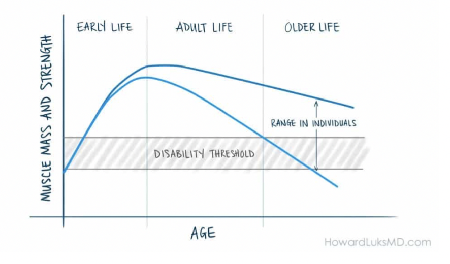 Consult Figure 1 to see the relationship of muscle mass and strength with age. Improving muscle mass allows people to surpass the disability threshold, improving longevity.