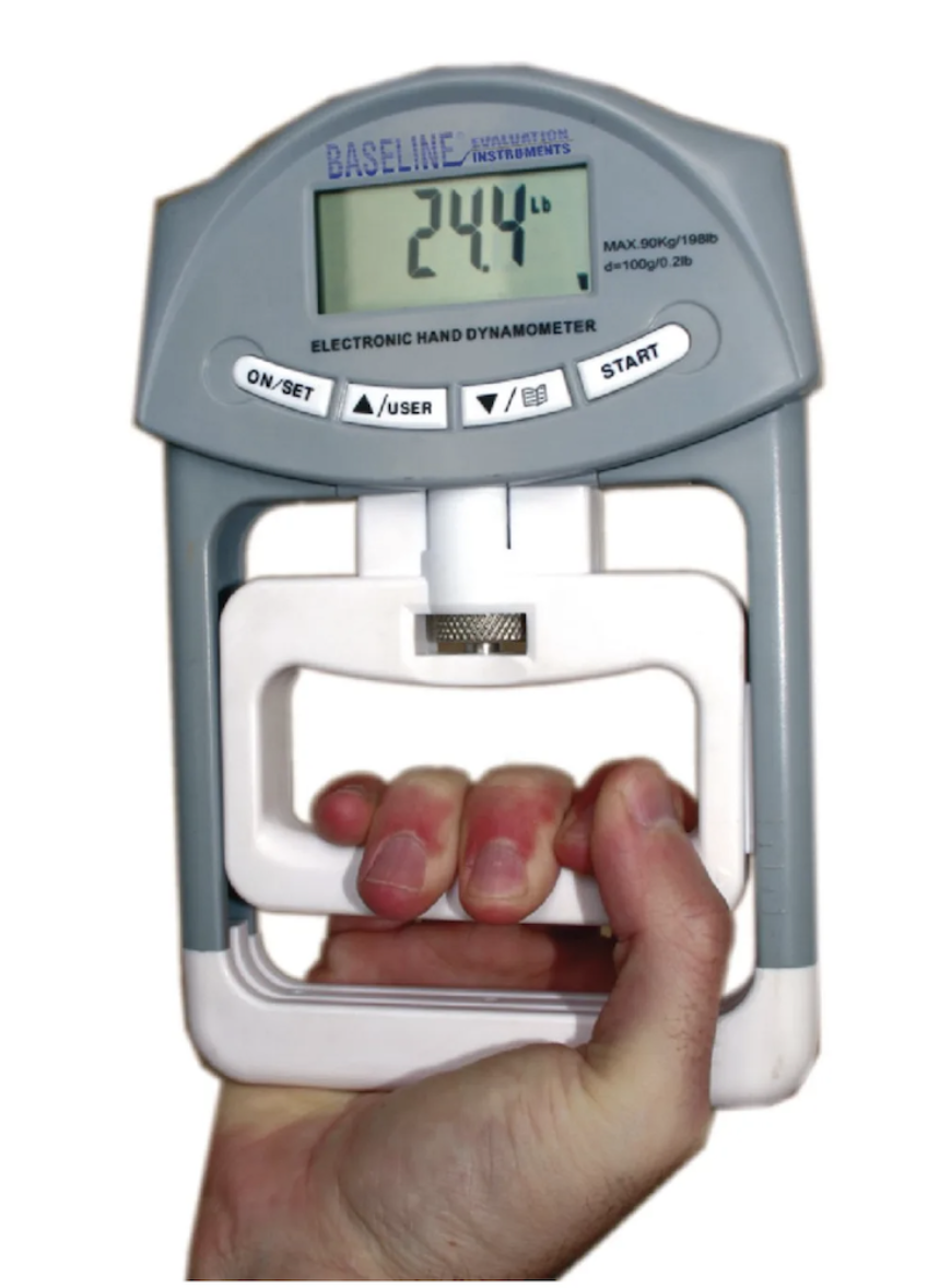 Some simple exercises that can be used to increase grip strength include ball squeeze (squeezing a tennis ball repetitively), general resistance training/use of free weights, climbing, as well as finger and palm stretches to alleviate strain in the hands. There are also grip strength devices you can purchase to increase your grip. Lifespan Society of BC has a grip strength measuring device (dynamometer) that members can ask to use at events or privately, by contacting us. An image of this is shown below.
